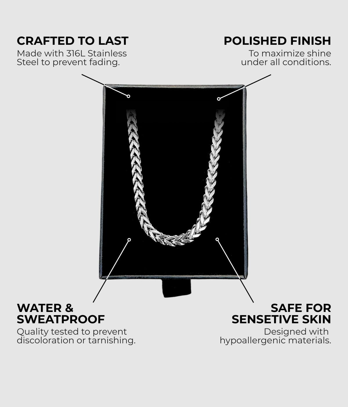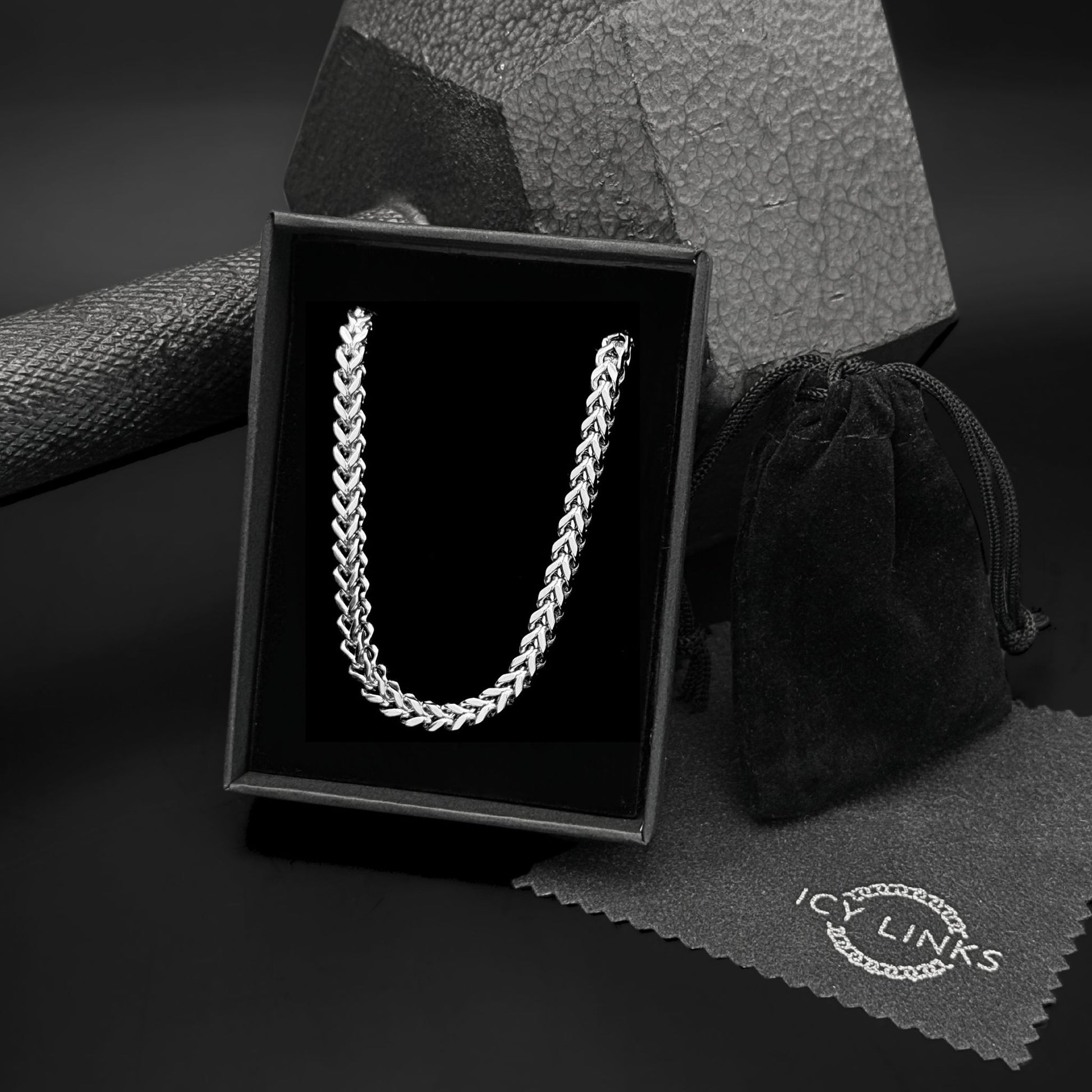 Expertly crafted with a proprietary blend of 316L surgical-grade stainless steel, our 4mm Franco Flex Chain offers durability and style. The polished finish is both stylish and affordable, while the hypoallergenic material is safe for sensitive skin. With the added benefit of being sweat-resistant and wearable in water without tarnishing or turning skin green, this chain is a real stainless steel investment.