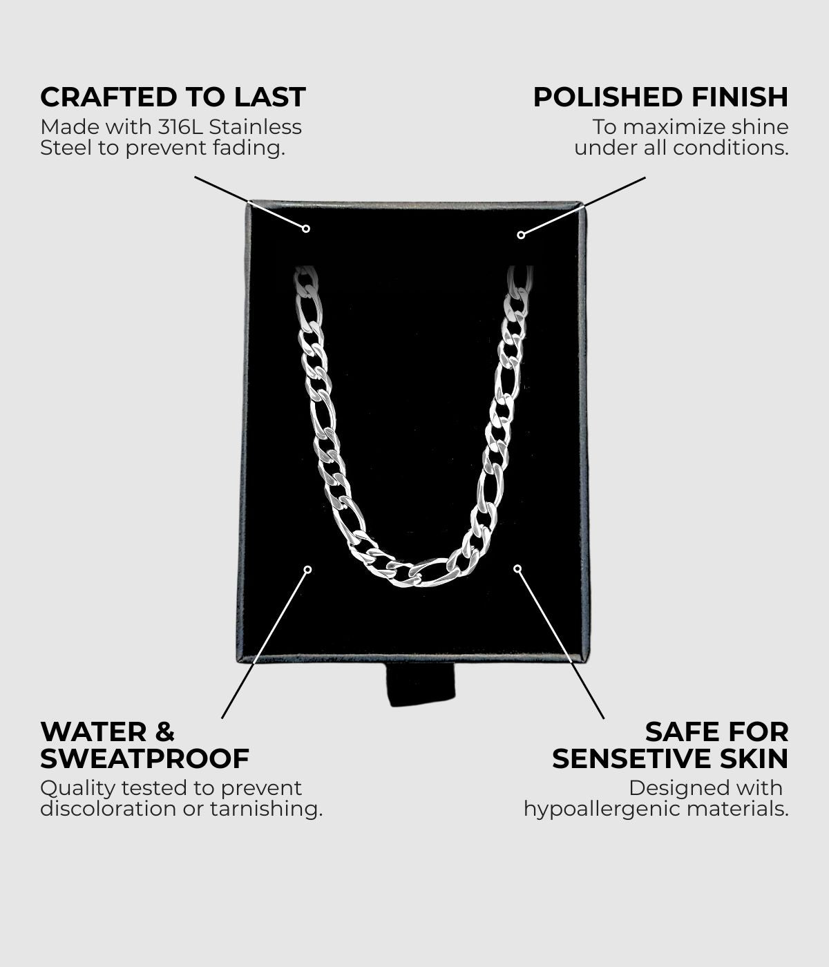 Expertly crafted with a proprietary blend of 316L surgical-grade stainless steel, our Power Link Chain Bracelet offers durability and style. The polished finish is both stylish and affordable, while the hypoallergenic material is safe for sensitive skin. With the added benefit of being sweat-resistant and wearable in water without tarnishing or turning skin green, this Figaro styled bracelet is a real stainless steel investment.