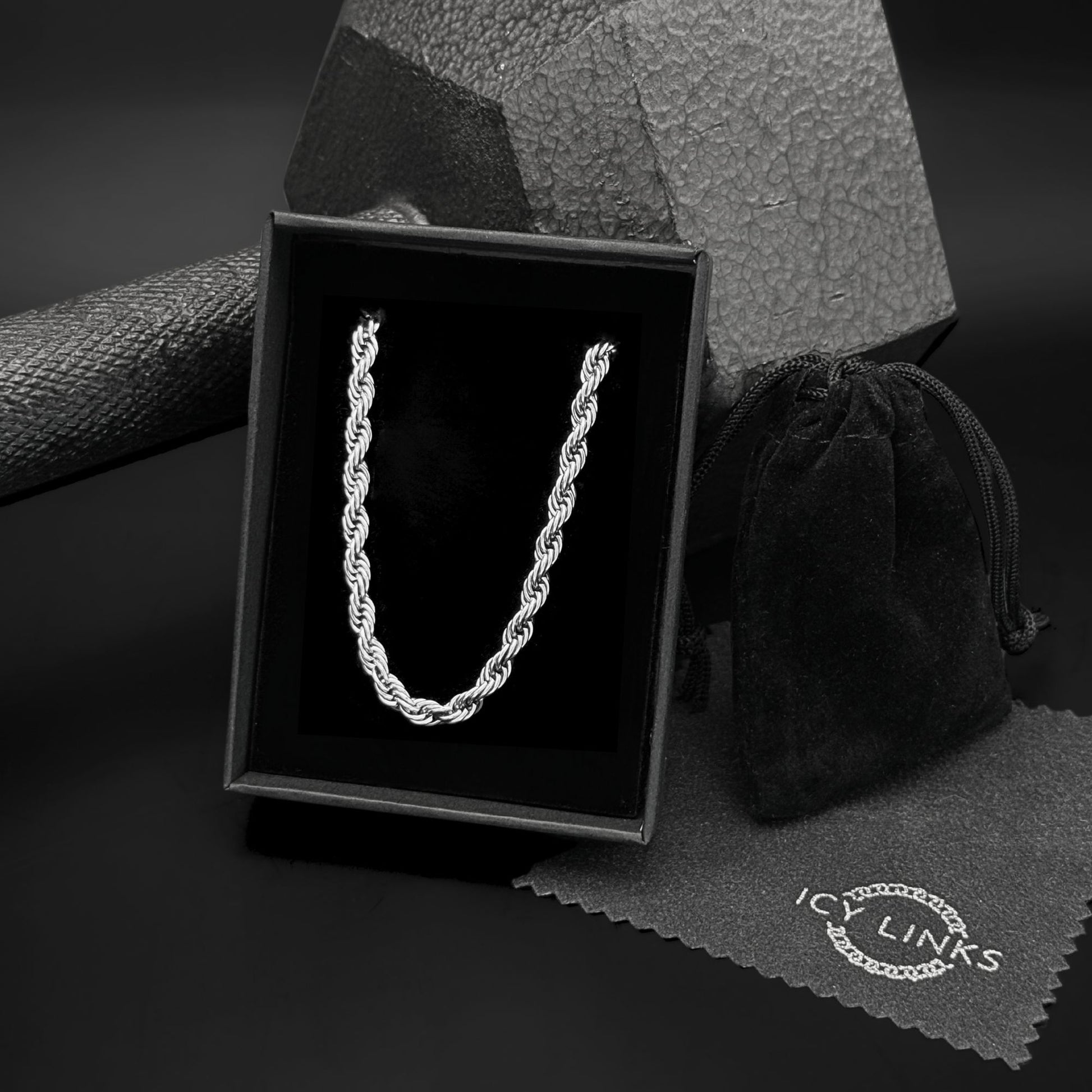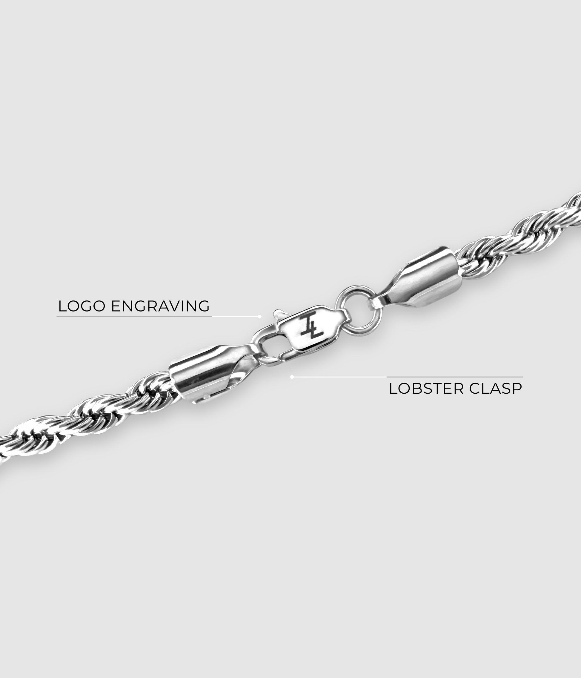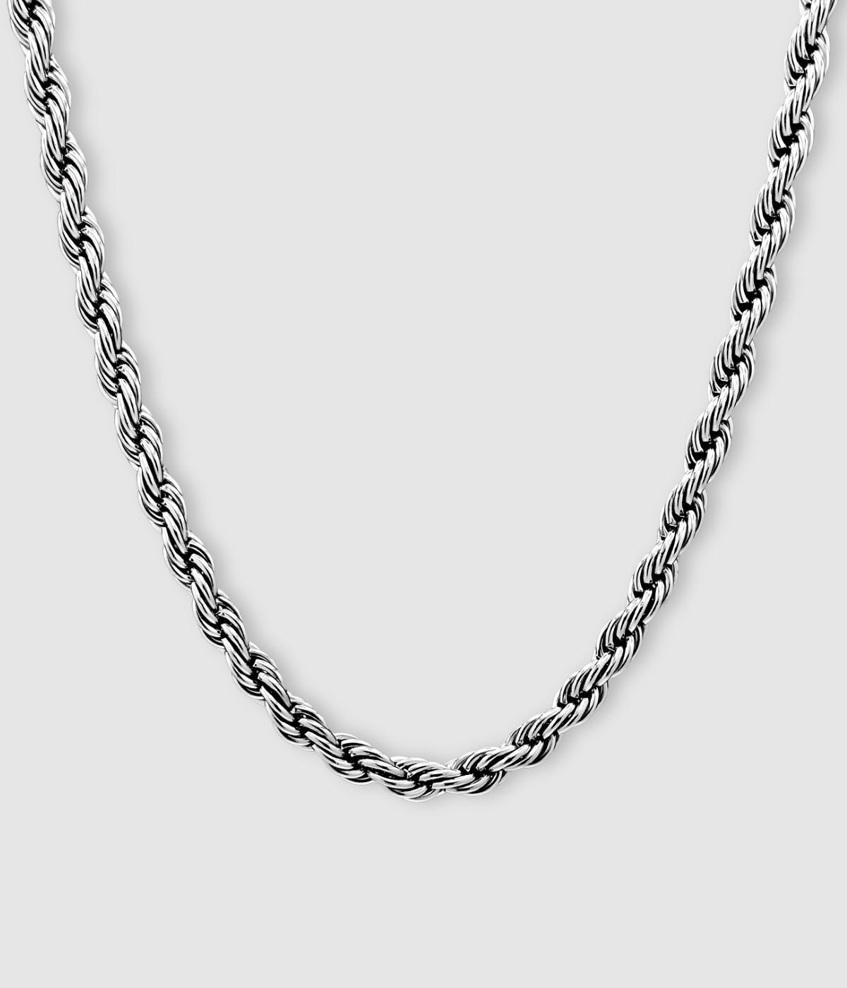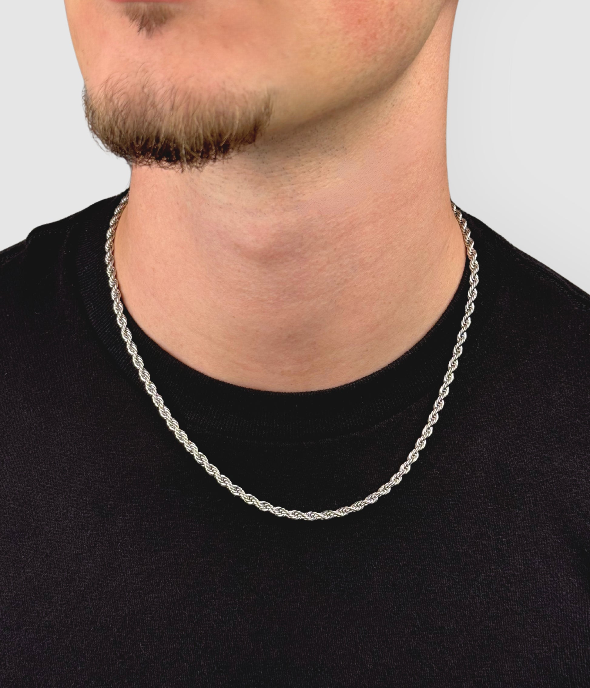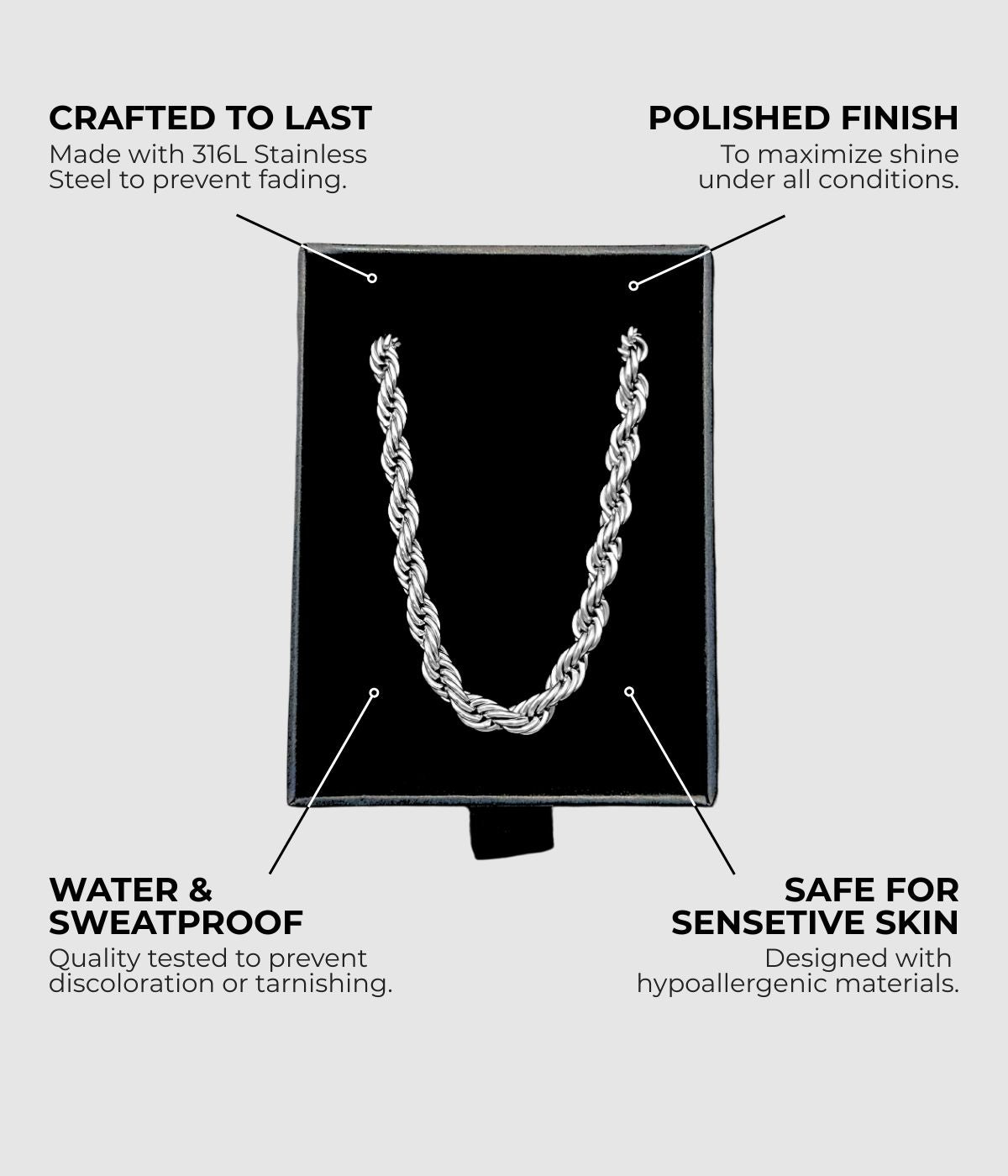 Expertly crafted with a proprietary blend of 316L surgical-grade stainless steel, our 4mm Everyday Rope Chain Necklace offers durability and style. The polished finish is both stylish and affordable, while the hypoallergenic material is safe for sensitive skin. With the added benefit of being sweat-resistant and wearable in water without tarnishing or turning skin green, this chain is a real stainless steel investment.